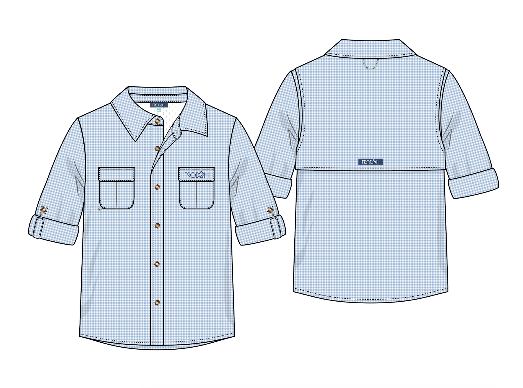 Reel in comfort and style with the PRODOH Long Sleeve Founders Kids Fishing Shirt in Clear Sky in Gingham — UPF 50+ Performance Stretch. Crafted from our updated 88% polyester / 12% spandex fabric, this shirt offers lightweight, breathable comfort with just the right amount of stretch for all-day wear. UPF 50+ sun protection blocks 98% of harmful rays, while the vented back keeps them cool from dock to dinner. Roll-up sleeves with button tabs, double chest pockets, and our signature "Get Back Here Loop" add functional details for every outdoor adventure.