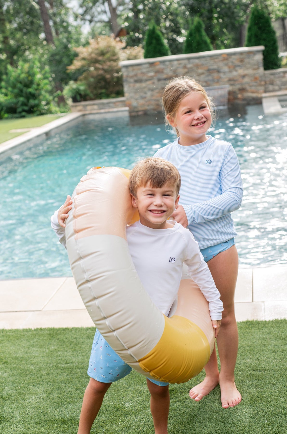 Give your little beach explorer the perfect blend of sun protection and seaside style with our Girls' Reef Rashguard Swim Set – The Coast Thin Stripe / Boats in the Bay Print. Designed in a cheerful pastel palette, this two-piece set features a long-sleeve rashguard in our fresh Coast Thin Stripe pattern and coordinating fully lined swim bottoms adorned with playful boats in the bay.