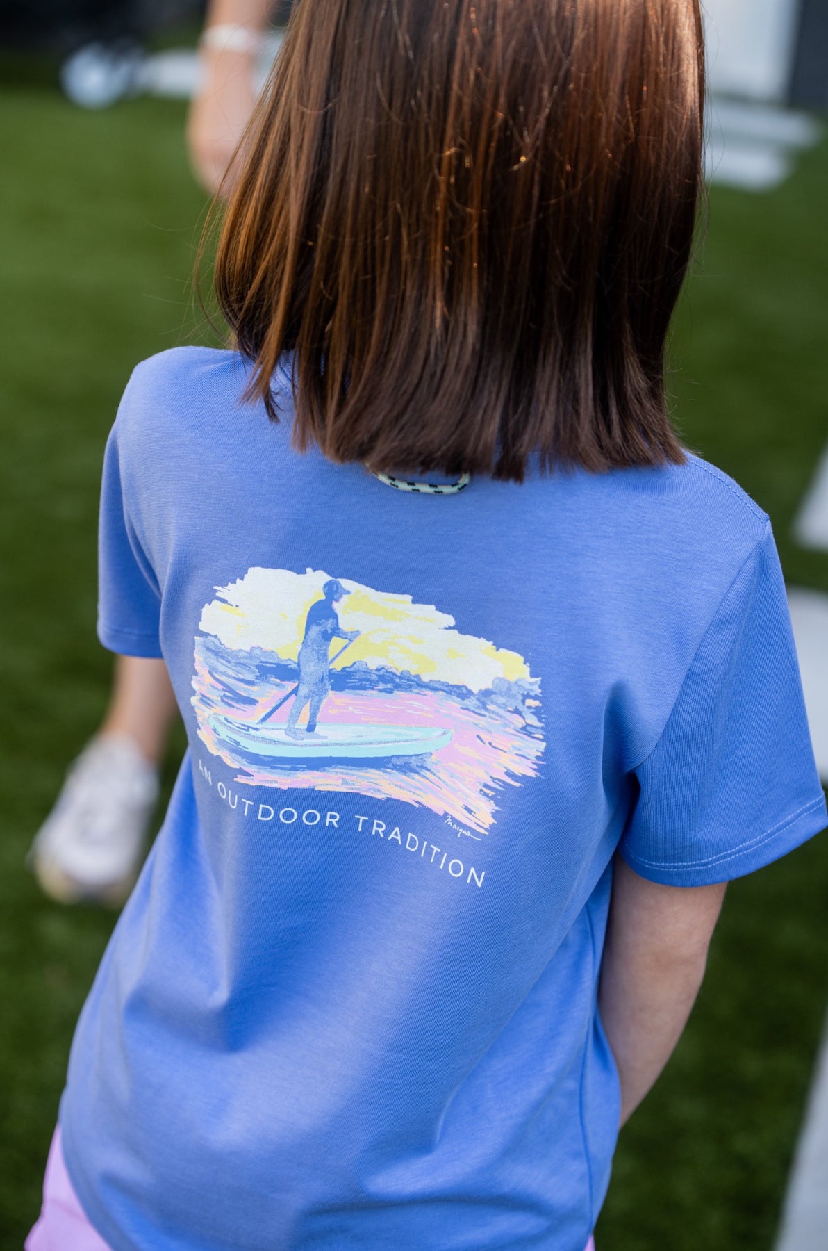 The Girl's Short Sleeve Cotton T-shirt with Paddleboard Sunset Art captures the magic of evenings on the water. Crafted from 100% breathable cotton, this tee pairs comfort with a custom hand-painted sunset paddleboard design—perfect for school days, weekends, or waterside adventures.